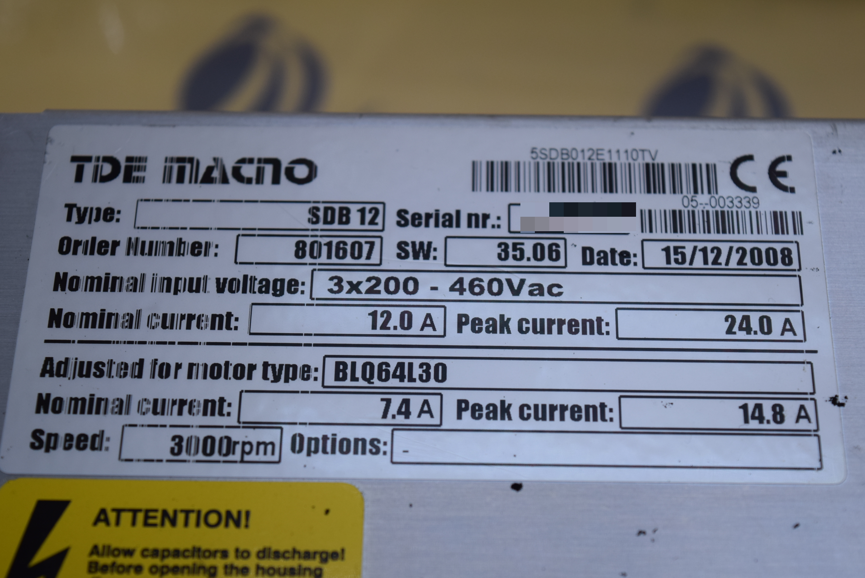 | 모델명 : SDB 12 품목명 : SERVO DRIVER 제조사 : TDE MACNO 증상 : 작동 불량 |