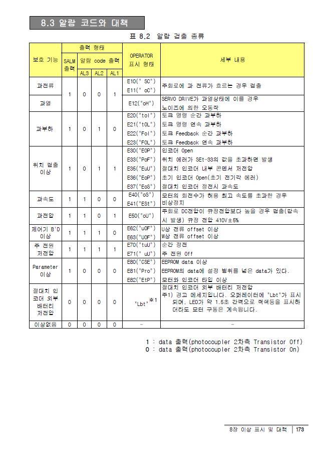 알람 및 트러블 슈팅 항목은 매뉴얼 173페이지에서 확인 가능합니다.