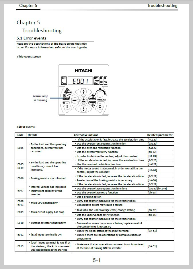 | E001 | By the load and the operating conditions, overcurrent has occurred | - If the acceleration is fast, increase the acceleration time [AC120] - Use the overcurrent suppression function [DA112] - Use the overload restriction function [BA122] - Use the overcurrent retry function [BA122] - In order to stabilize the control, adjust the constant [HA-01] |