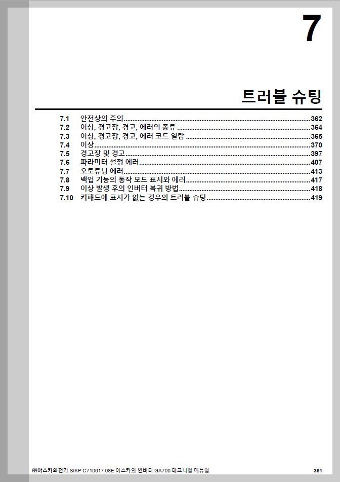 알람 및 트러블 슈팅 항목은 매뉴얼 361페이지에서 확인 가능합니다.