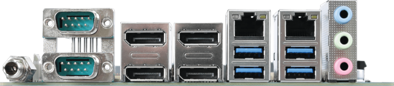 | Rear I/O | 3 x Audio jacks (Line in, Line out, Mic in) 2 x COM ports (RS-232/422/485 and RI/5V/12V) 4 x Display Ports 2 x RJ45 LAN ports 4 x USB 3.0 1 x DC Jack (+12V~24VDC) |