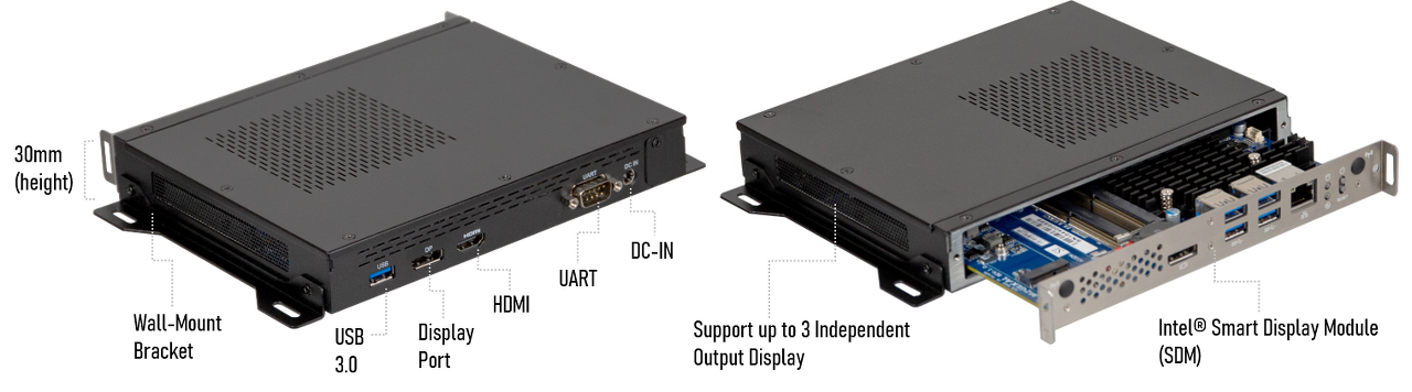 7세대 Intel® Core™ i5/i3 및 Celeron® 프로세서를 기반으로 하는 SDM(스마트 디스플레이 모듈) 시리즈와 함께 사용할 수 있습니다. 컴팩트한 디자인은 벽걸이형(기본값)이든 VESA 75/100(옵션)을 사용하여 패널 PC 또는 디지털 사이니지 뒤에 수직 및 수평으로 배치하든 공간이 제한된 환경에 이상적입니다. 또한 SDM은 업그레이드 및 유지 관리가 용이하여 SKU 조합에 대해 선호하는 SDM을 선택할 수 있을 뿐만 아니라 전체 미디어 디스플레이 장비를 변경하지 않고도 향후 더 높은 사양의 SDM으로 전환할 수 있습니다.
