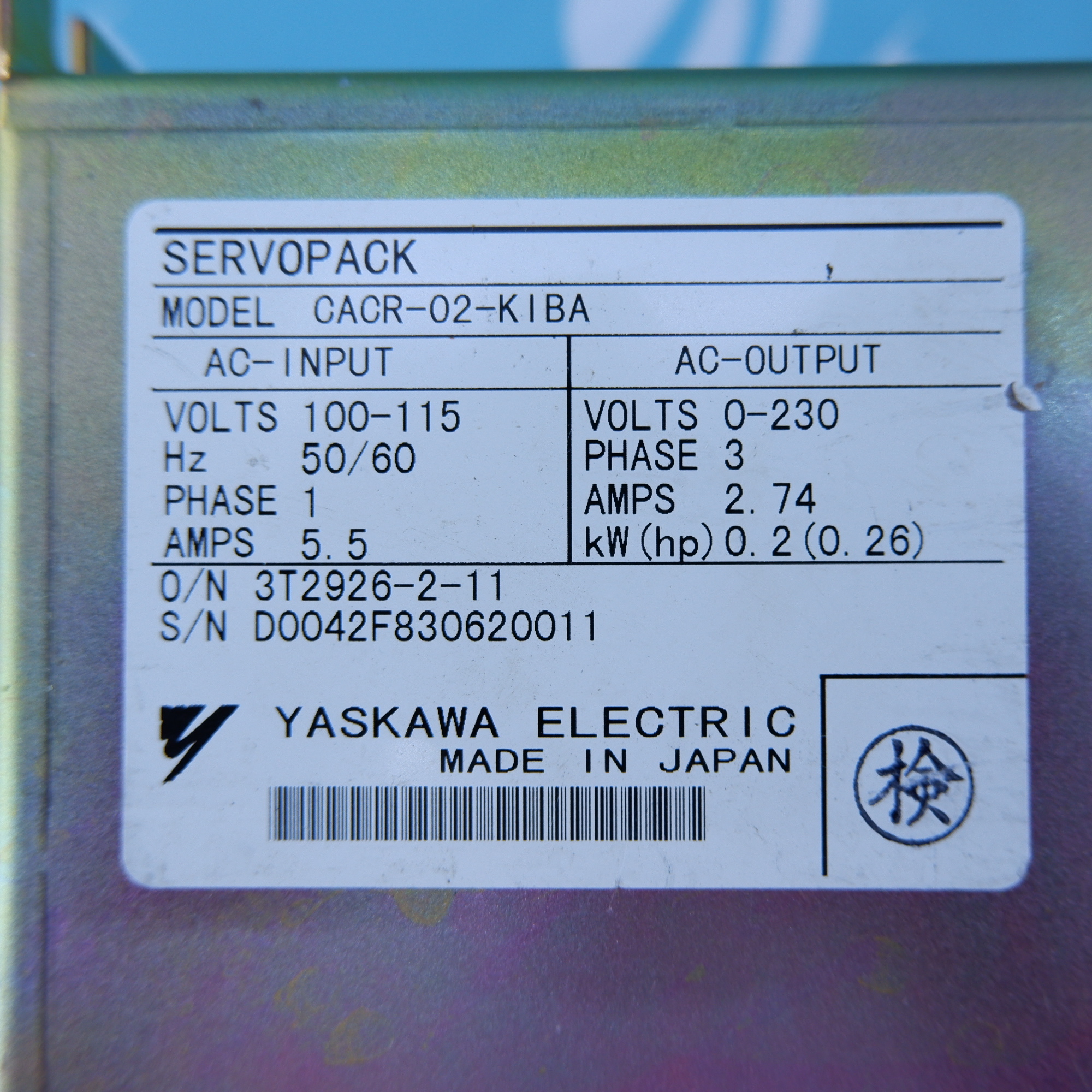 MANUFACTURER : YASKAWA MODEL : SERVOPACK CACR-02-KIBA
