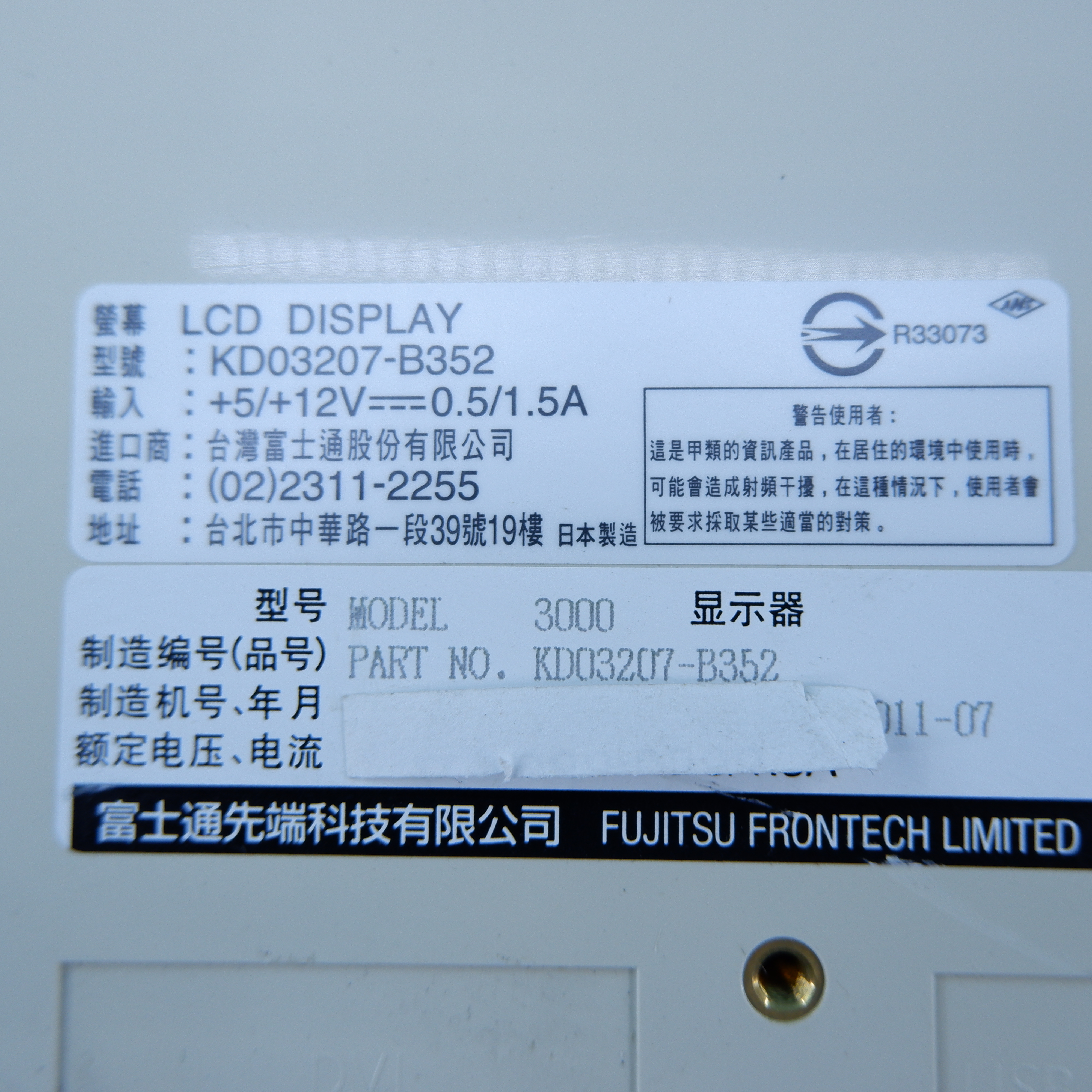 MANUFACTURER : FUJITSU MODEL : LCD DISPLAY 3000 KD03207-B352