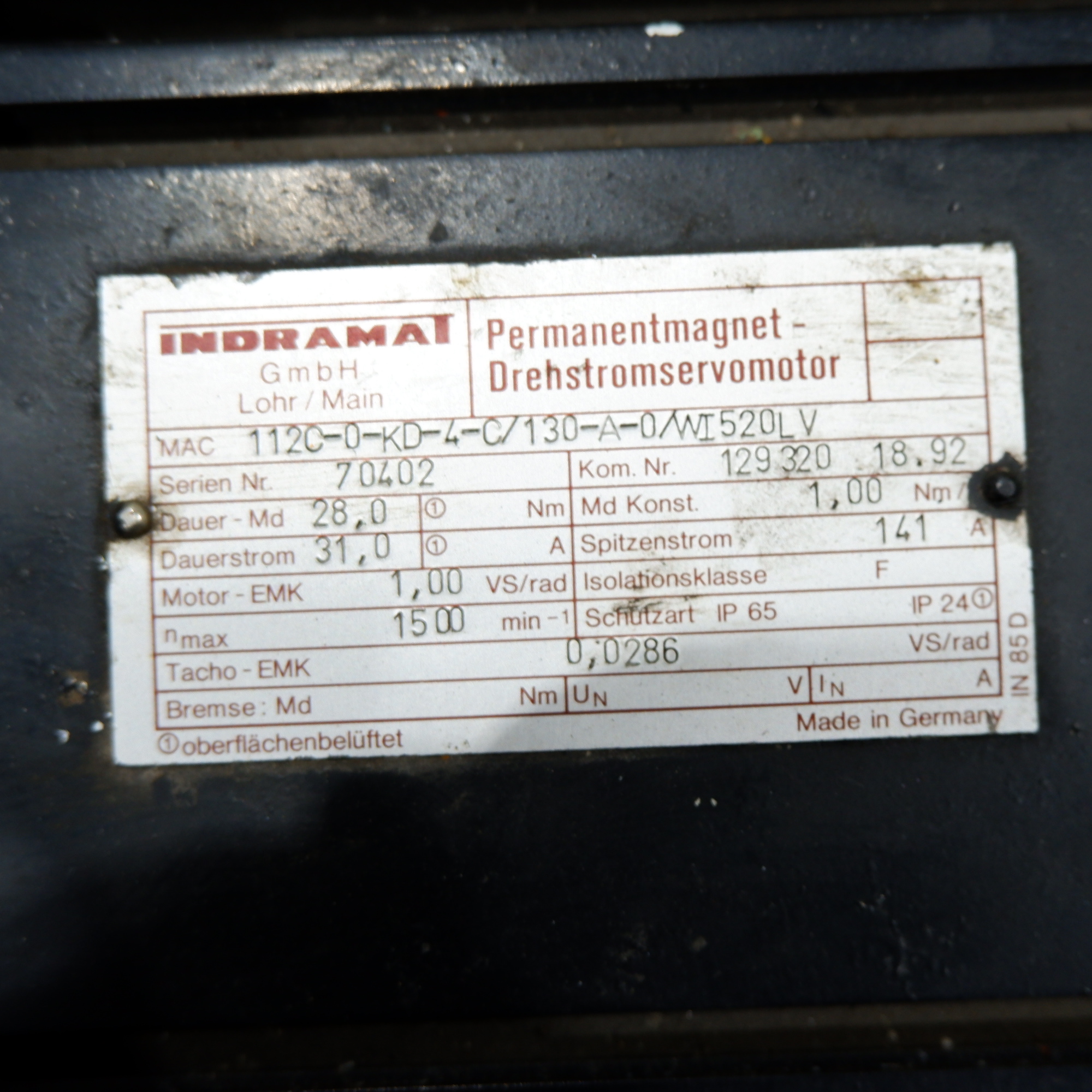 MANUFACTURER : INDRAMAT   MODEL : PERMANENTMAGNET-DREHSTROMSERVOMOTOR 112C-0-KD-4-C/130-A-0/WI520LV