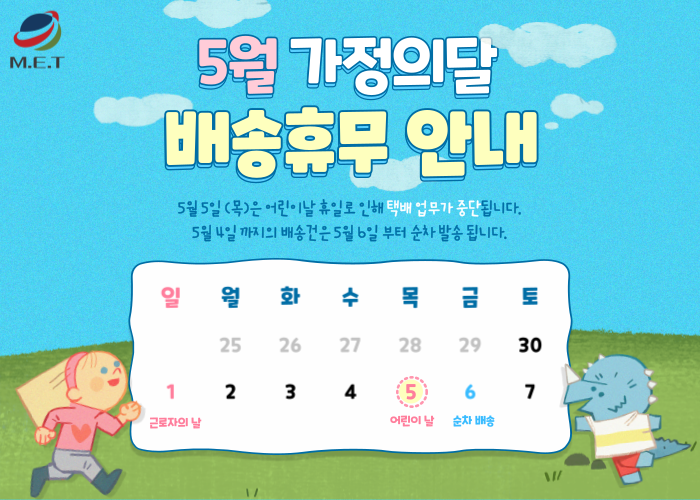 어린이날 휴일로 인하여 택배 업무가 중단됩니다.
