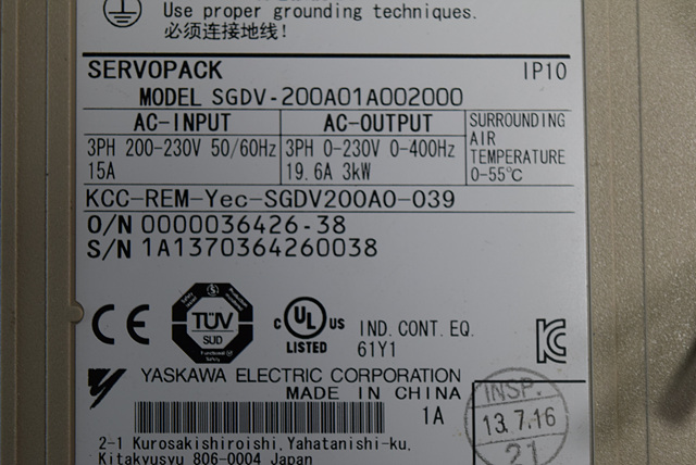 MANUFACTURER : YASKAWA MODEL : AC SERVO SGDV-200A01A002000