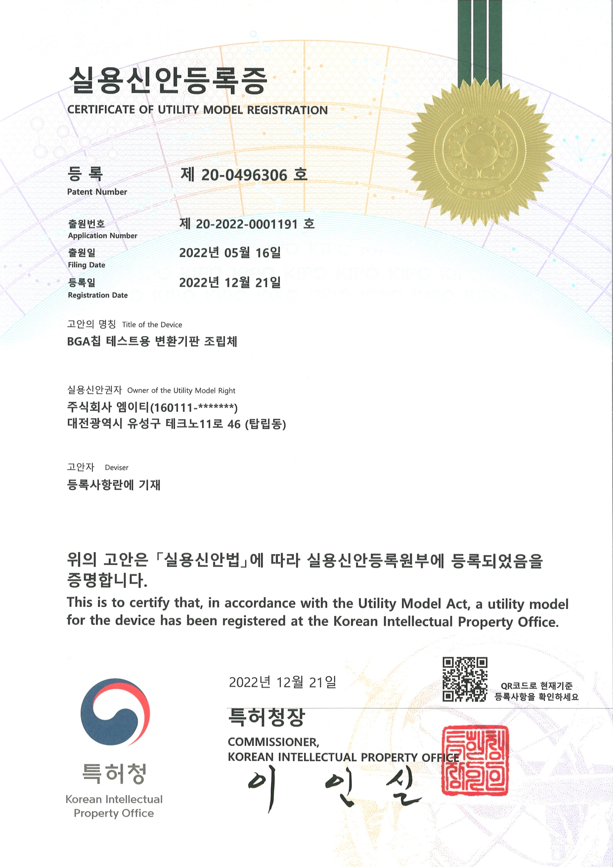 또한, BGA칩 테스트용 변환기판 조립체 실용신안을 등록하여