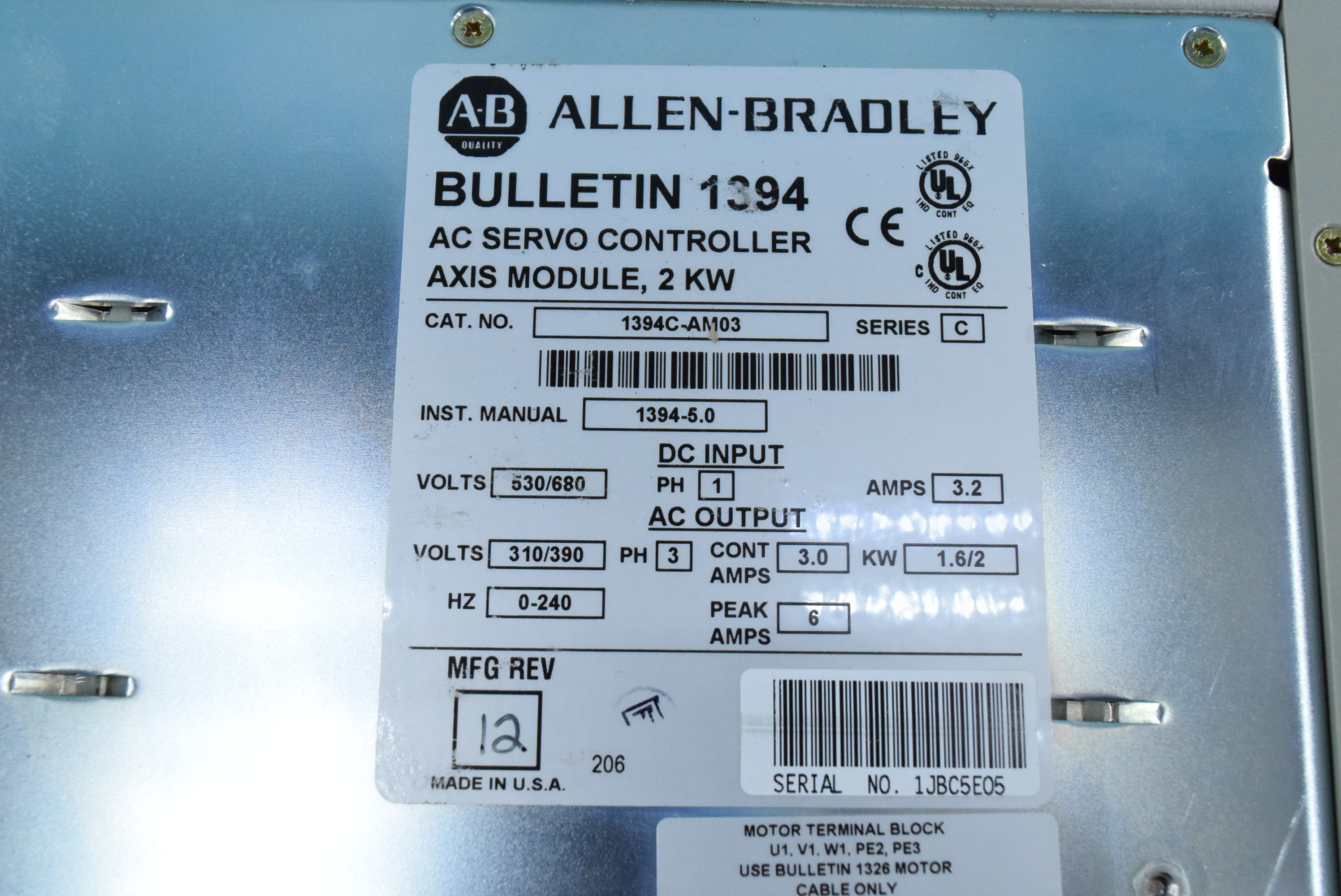 MANUFACTURER : ALLEN-BRADLEY MODEL : BULLETIN 1394 AC SERVO CONTROLLER 1394C-AM03