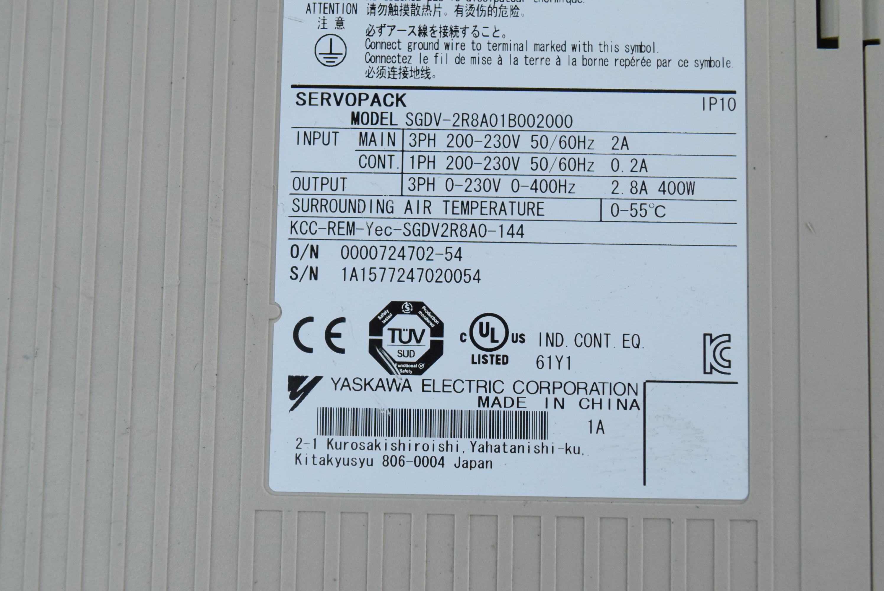 MANUFACTURER : YASKAWA MODEL : SIGMA-V 400W SGDV-2R8A01B002000 (NO COVER)