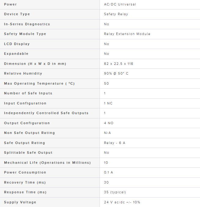 Safety Outputs: 4 NO, 6 A; Aux Outputs: None