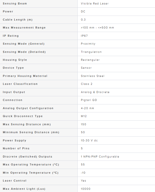 Range: 50-150 mm; Input: 10-30 V dc; Outputs: Analog: 0-10 V