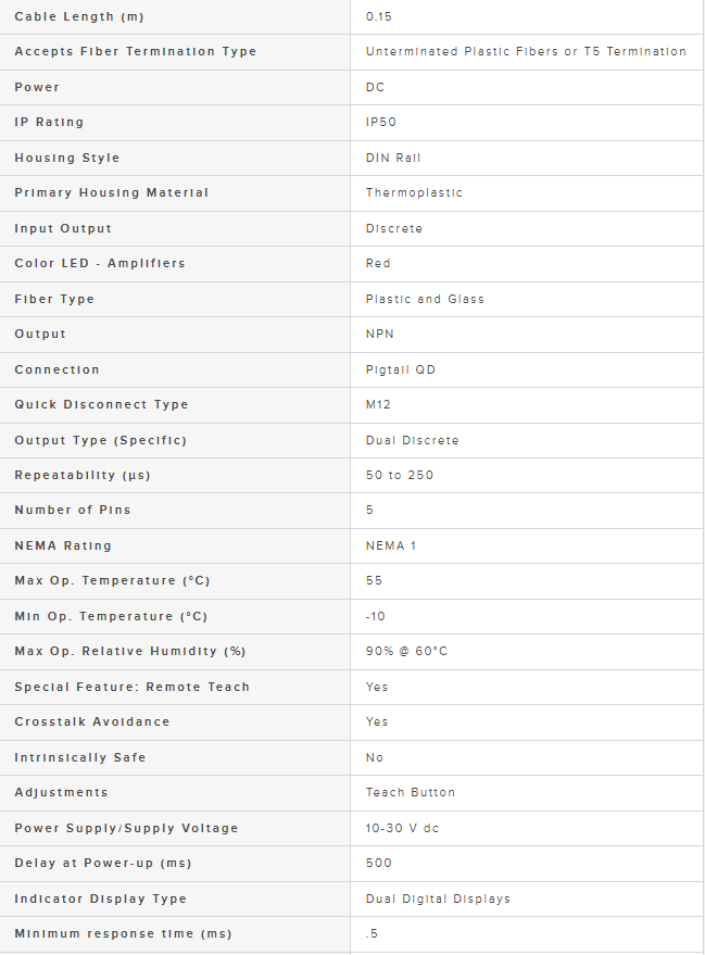 Range: Depends on Fiber; Input 10-30 V dc