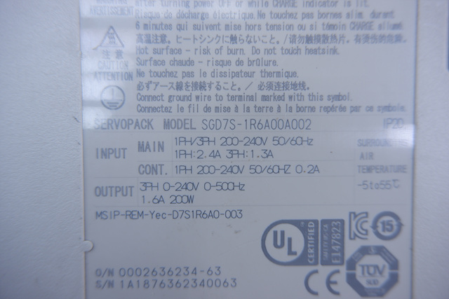 MANUFACTURER : YASKAWA MODEL : SERVO DRIVER SGD7S-1R6A00A002